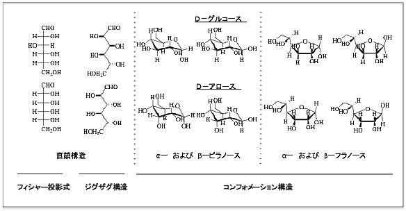一般に単糖;ここでは六炭糖についてのべるが、は水溶液中ではαーおよびβーそれぞれのピラノースとフラノースの4種のリング構造が大部分であり、少量の直鎖構造で存在している。